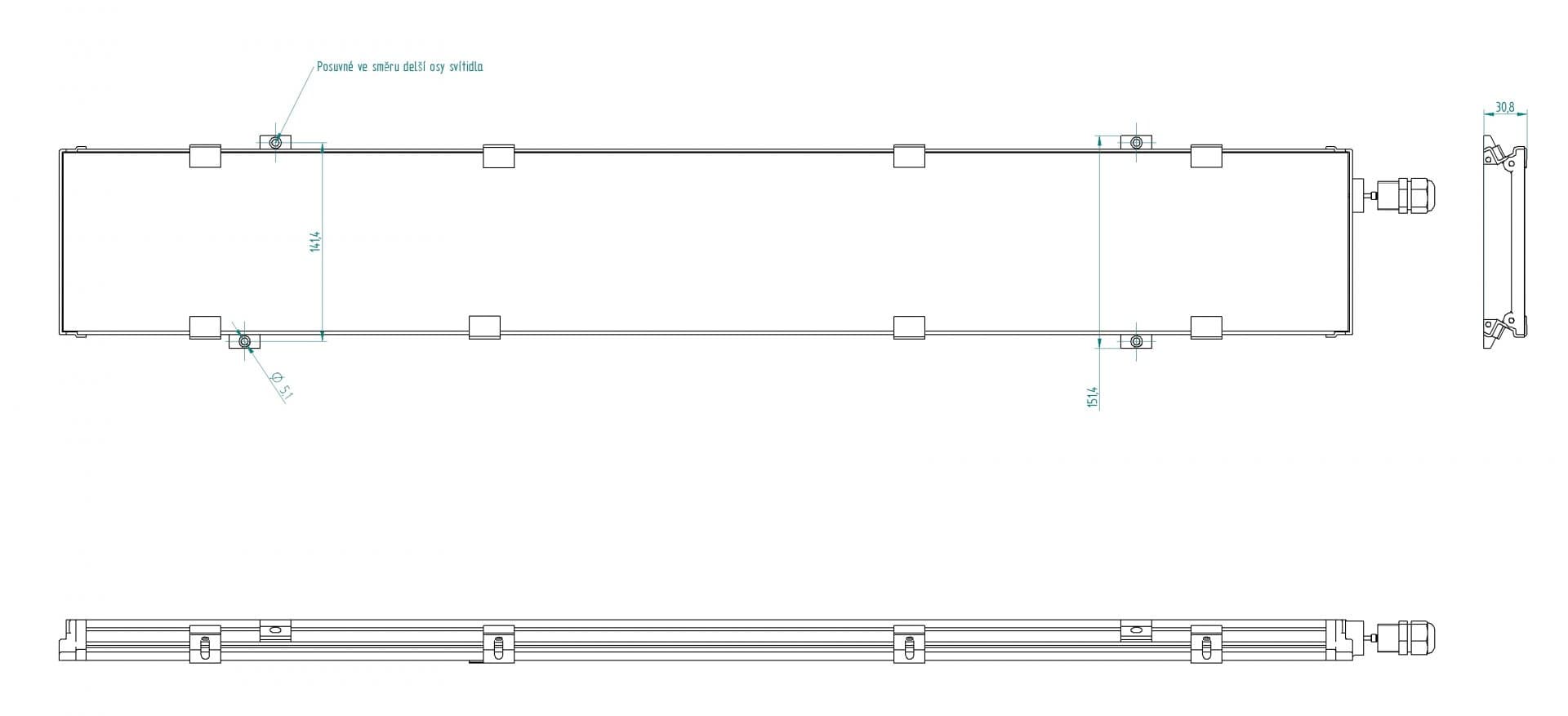 Nosný profil je utěsněn polyuretanovým těsněním, které odolává všem známým mazacím a řezným kapalinám. Čelní strana svítidla je zakryta 4 mm silným kaleným sklem s mimořádnou odolností proti rozbití. Obě postranní čela svítidla jsou vybavena závity pro vývodku M20x1,5, takže je možné zvolit osazení vývodky vlevo (L), vpravo (R) nebo pro průchozí napájení (LR). Připojovací svorkovnice je skryta pod vývodkou.